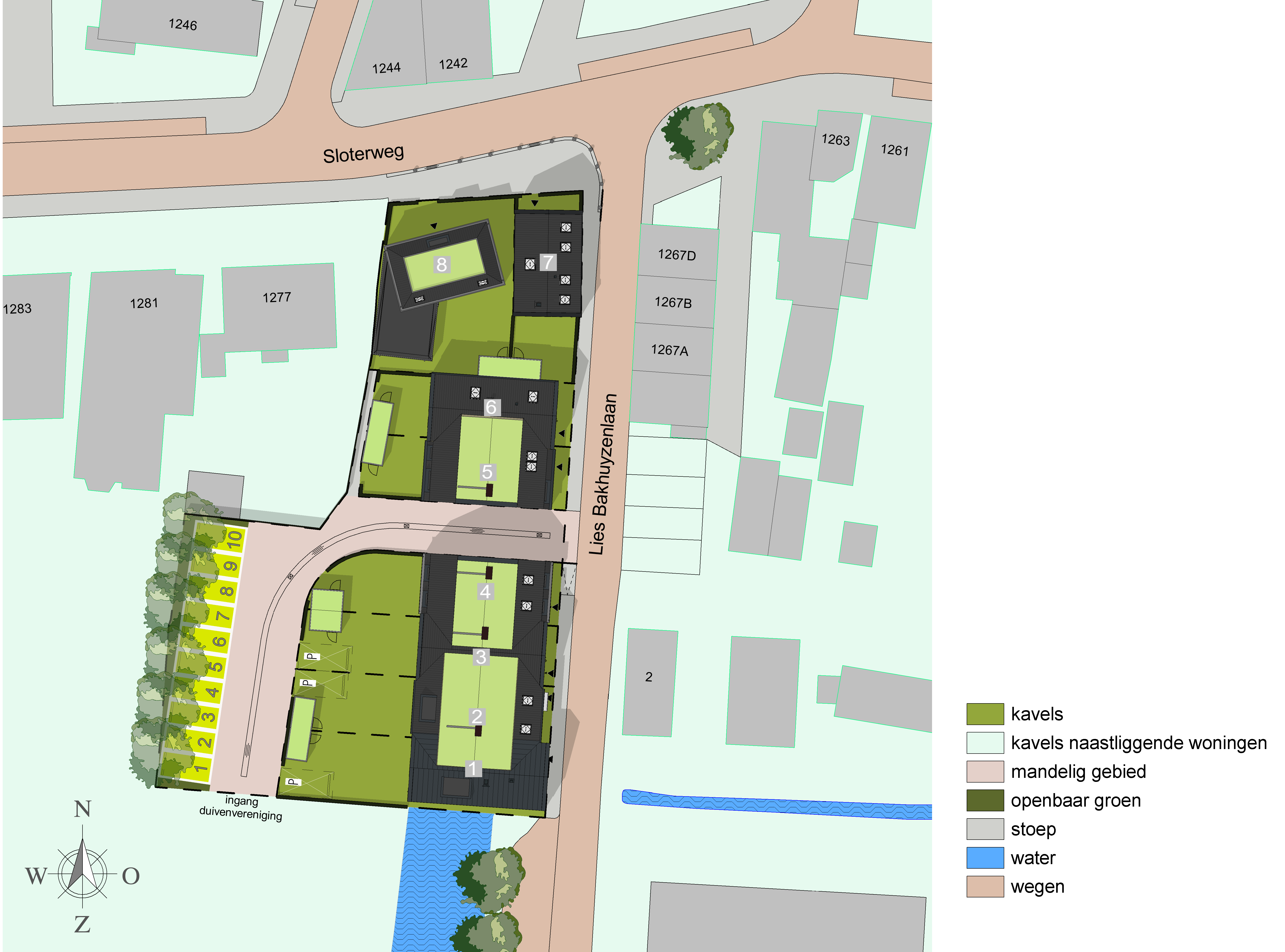 De woningen zijn gelegen op eigen grond, dus geen erfpacht. Zes woningen liggen aan de Lies Bakhuyzenlaan, waarvan vier statige herenhuizen en een twee-onder-één-kapwoning. Aan de Sloterweg komen twee unieke vrijstaande woningen.